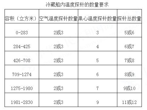 (三)冷處理按照出口運輸途中冷處理操作程序(詳見附件)進行,冷藏船內需根據空間容量放置溫度探針,分別測量空氣溫度和果心溫度,探針的數量應滿足如下要求: